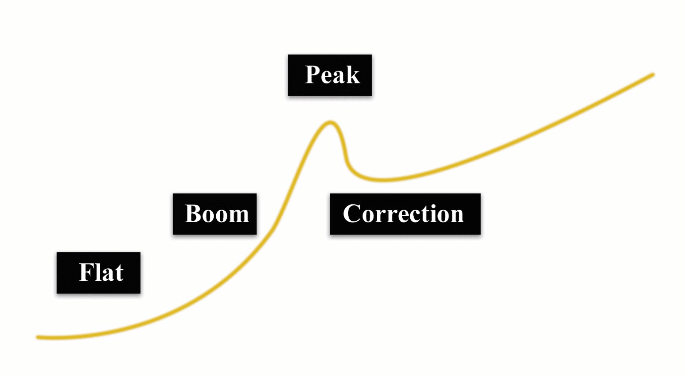 The property markets all follow a cycle. It starts with a flat period where supply equals demand, which is then followed by a boom. Most booms last about 3-4 years, and then they peak, which is where prices reach the absolute maximum for the cycle. Next, the market has a correction where an oversupply comes on the market, and prices drop to boost sales. Once the supply levels out, the market goes back to another flat period, and the cycle starts all over again.