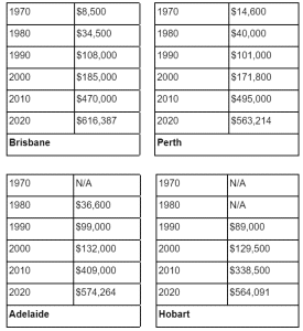 Imagine that it’s 1980 and your house just rose 400% from $8,000 to $32,000 in the last 10 years, and we say to you “Whatever you do, don’t sell this house – because in 10 years from now, it will be worth 300% more again”. You would have said we were mad! Well, that actually happened! As long as the population increases, property prices will go up. So what are the facts? Below are the historical median house prices for the Australian major cities for 40 years between 1970 and 2020. In the decade between 2000 to 2010 every city, except Sydney and Hobart which only just missed out, more than doubled in value. And Sydney and Melbourne have rocketed off again in the last two years. If you want a real thrill, look at what happened in the 1970s and 1980s!